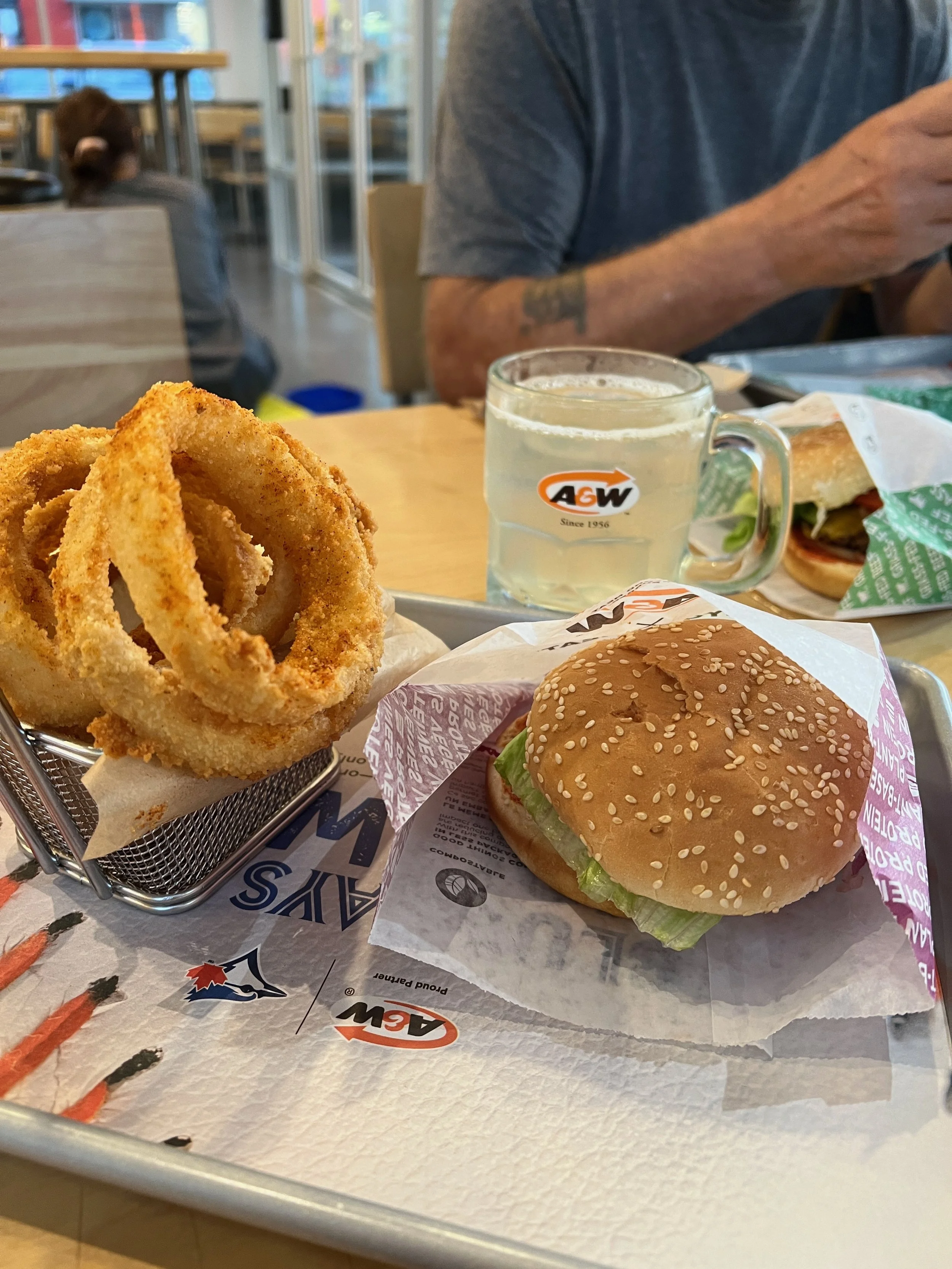 While I always loved A&W it wasn’t until going vegan that I really appreciated them. They have become my “safe place” to eat. If I’m not in an area I know well, or a place that doesn’t have any vegan restaurants (hello I live in farm country) there’s always an A&W around I can stop at. My usual order is a Beyond Meat burger hold the mayo, onion rings, and lemonade.